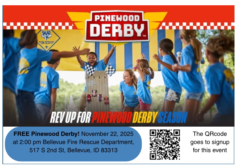 Get ready for Bellevue’s FREE Pinewood Derby on November 22, 2-4 pm! Scouting America and Pack 191 will be sponsoring the event. Cars will be provided for the race, or bring your own! Dutch oven cooking and desserts served afterwards. For more information, or to sign-up please scan the QR code!