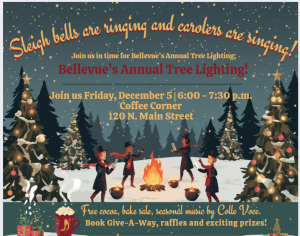 Join us FRIDAY night from 6-7:30 pm at Bellevue’s Coffee Corner (120 N. Main St.) for our Annual Tree Lighting! Bake sale, Santa, Colle Voce, Art & Soul Dance Academy