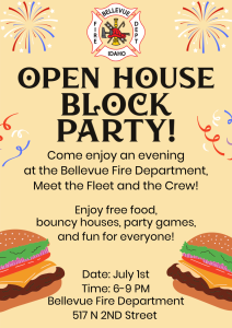 Reunión del Consejo Municipal mayo 26 @ 5:30 pm - 8:30 pm Jornada de puertas abiertas del Cuerpo de Bomberos de Bellevue 517 N. 2nd Street, Bellevue, ID, United States
